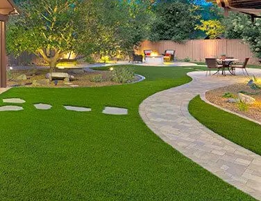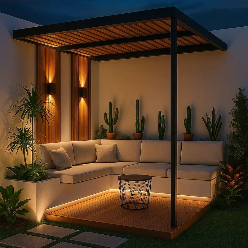 - الإضاءة وديكورات الأرضيات: استخدام إضاءة خافتة وموزعة بشكل فني،يبرز جمال الحديقة ليلاً. كما يتم استخدام الحجر الطبيعي أو الخشب الصناعي للأرضيات والممرات.