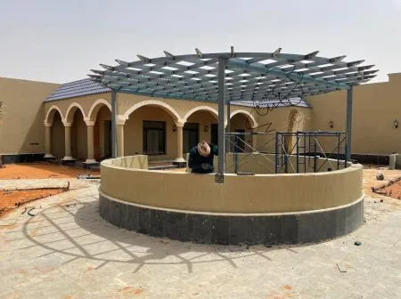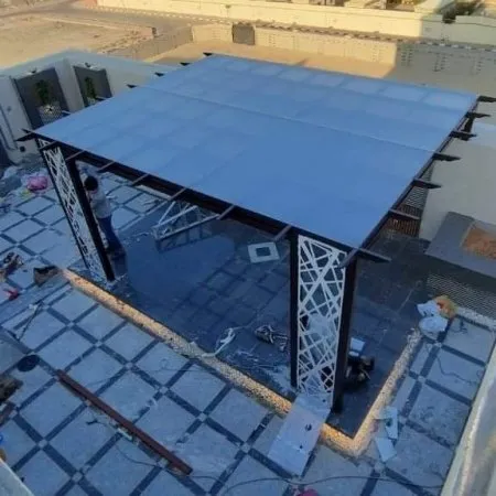 - قوة الهيكل: استخدام أعمدة وكمرات ذات سماكة مناسبة لتحمل الرياح القوية، خاصة في المناطق المفتوحة.