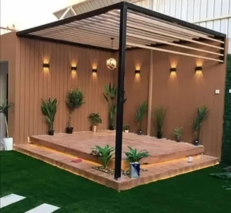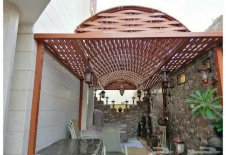 - البرجولات الخشبية المعالجة لإنشاء جلسات عائلية هادئة ومريحة في الحدائق.