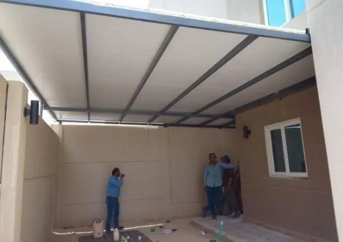 هو عبارة عن ألواح مسبقة الصنع تتكون من طبقتين من الصاج المجلفن (المطلي بطلاء حراري)،يتوسطهما و بناء ملاحق اسمنت بورد مادة عازلة بكثافة عالية مثل "البولي يوريثان".وايضاء تركيبمظلات حدائق للمنزل