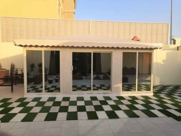 - بيوت الشعر الزجاجية: استخدام واجهات زجاجية بالكامل يسمح بإطلالة بانورامية على الحديقة مع الحفاظ على خصوصية بيت الشعر من خلال الستائر الذكية.