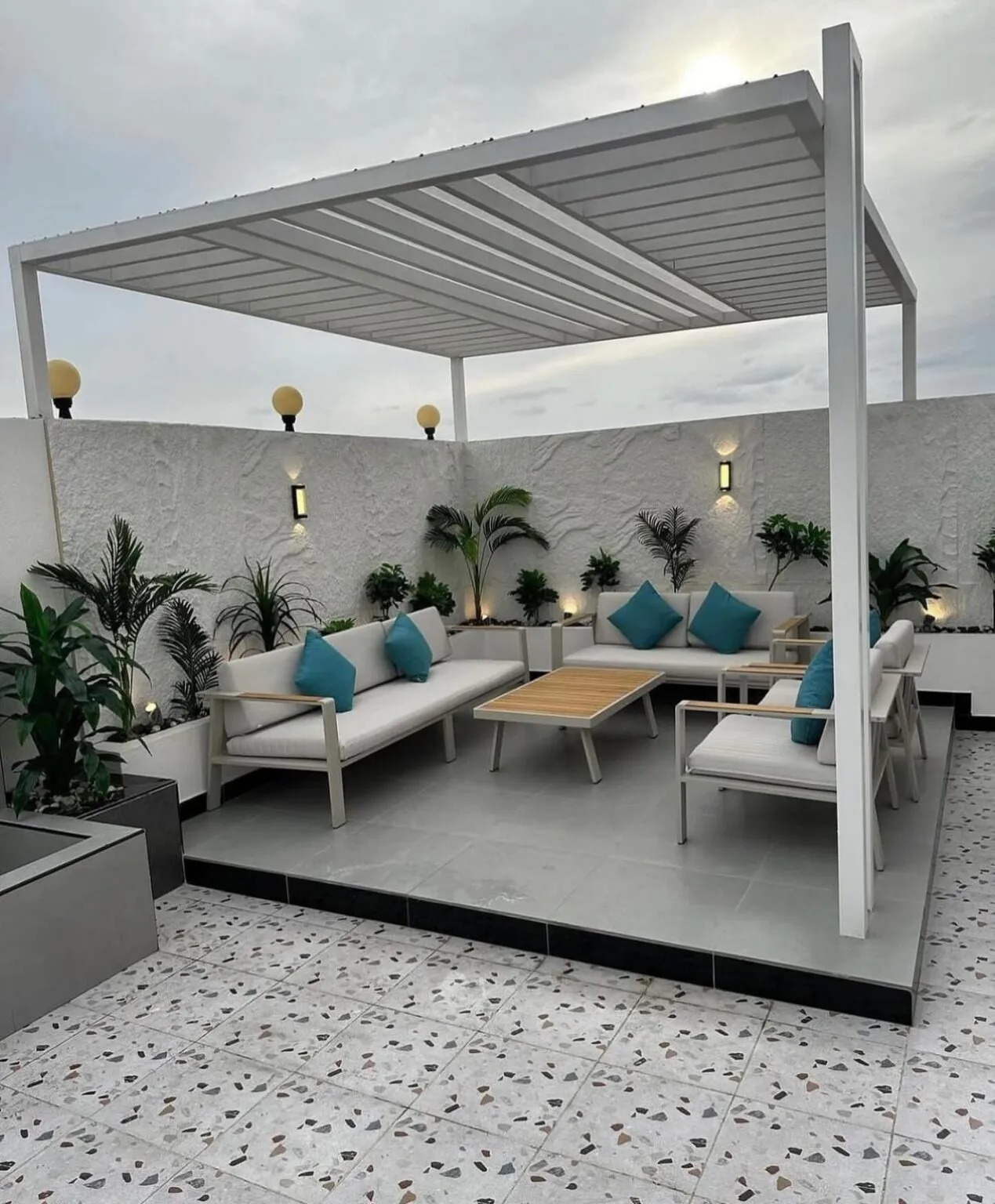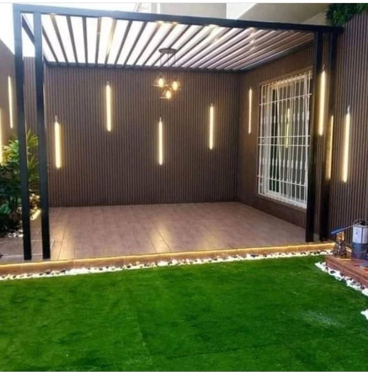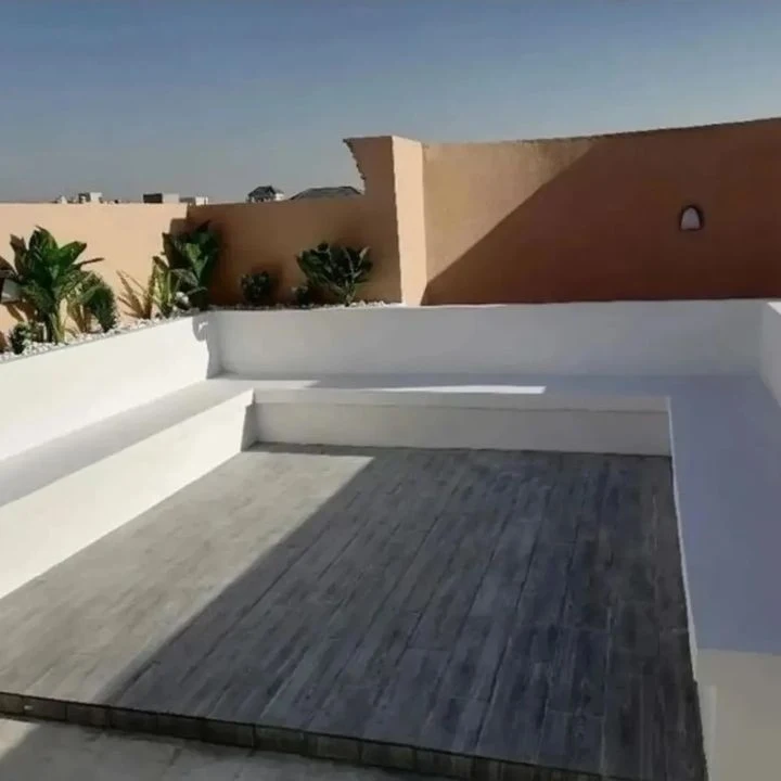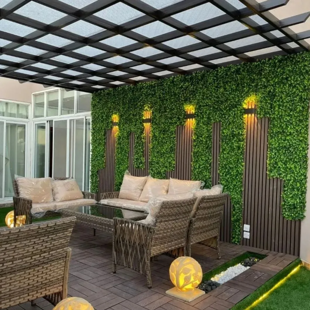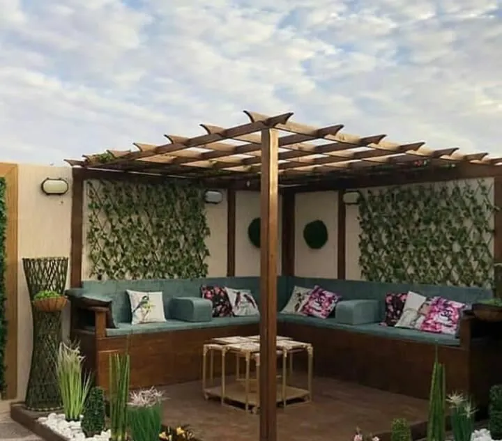 - تغطية الأرضيات: استخدم العشب الصناعي (النجيل) أو خشب "الباركيه الخارجي" الذي يتحمل الشمس والمطر.
