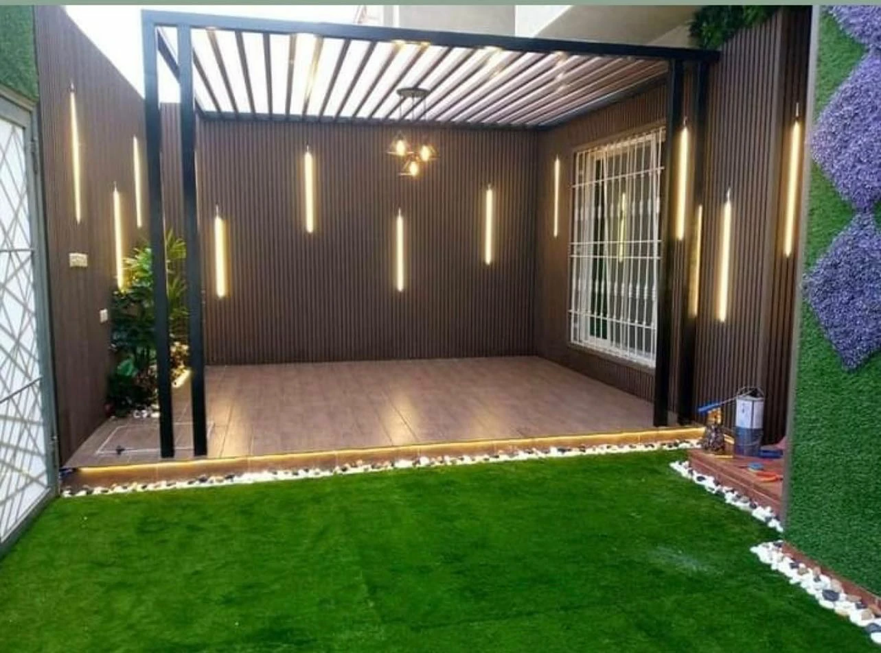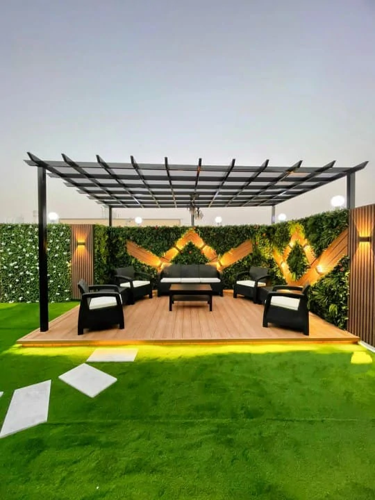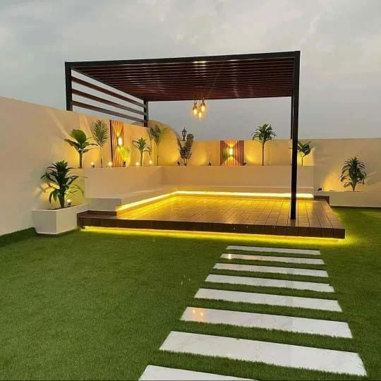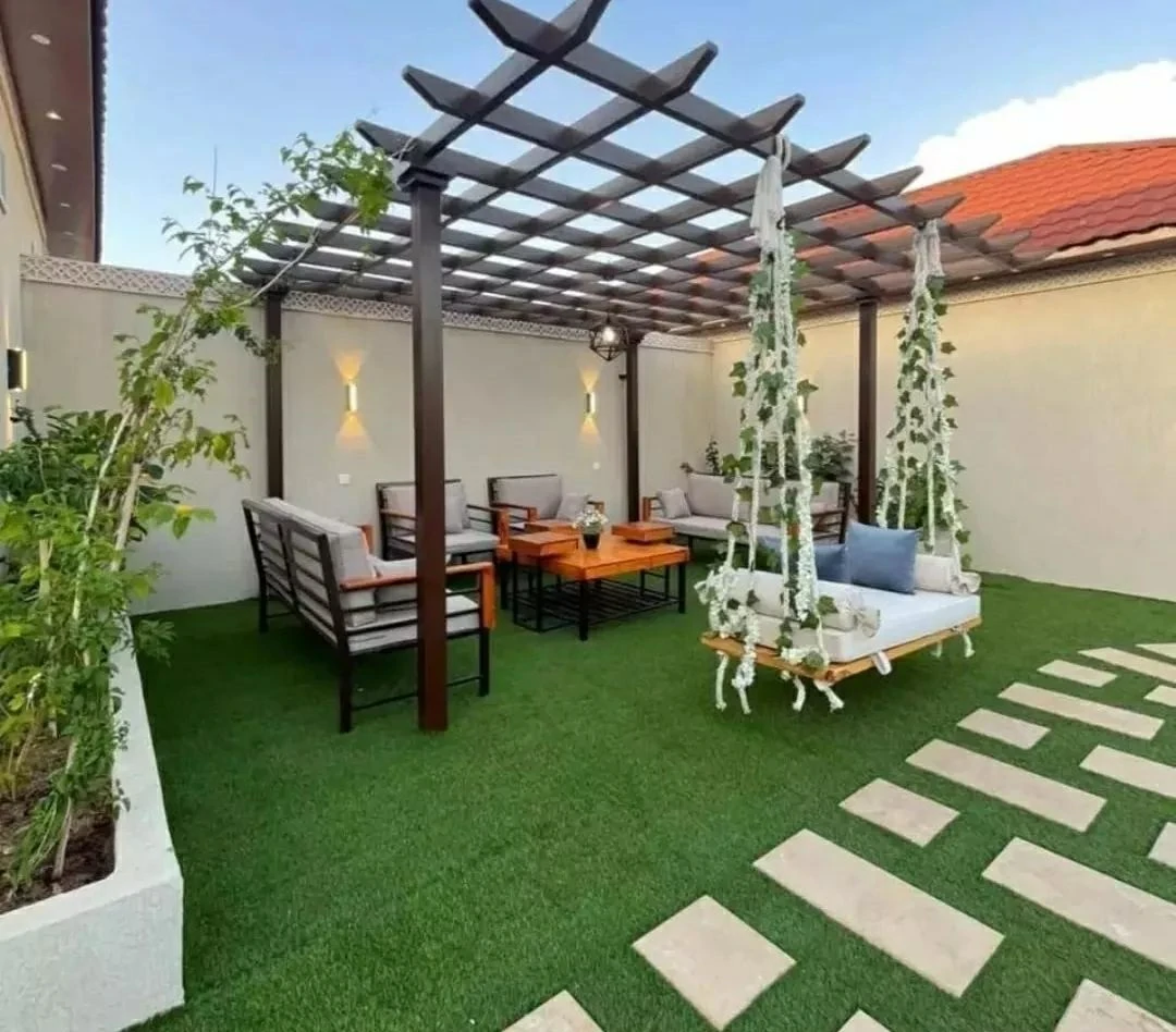 - الظل: لا يمكن إهمال أهمية الظل. الاعتماد على برجولات خشبية أو من الألومنيوم بتصاميم عصرية، مع استخدام مظلات شراعية أنيقة.