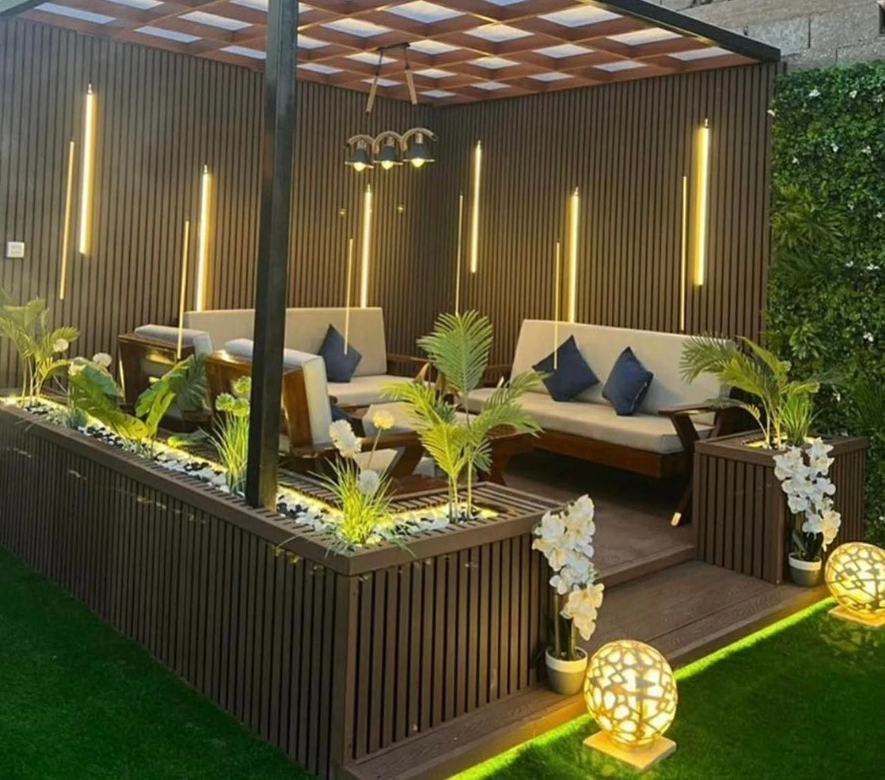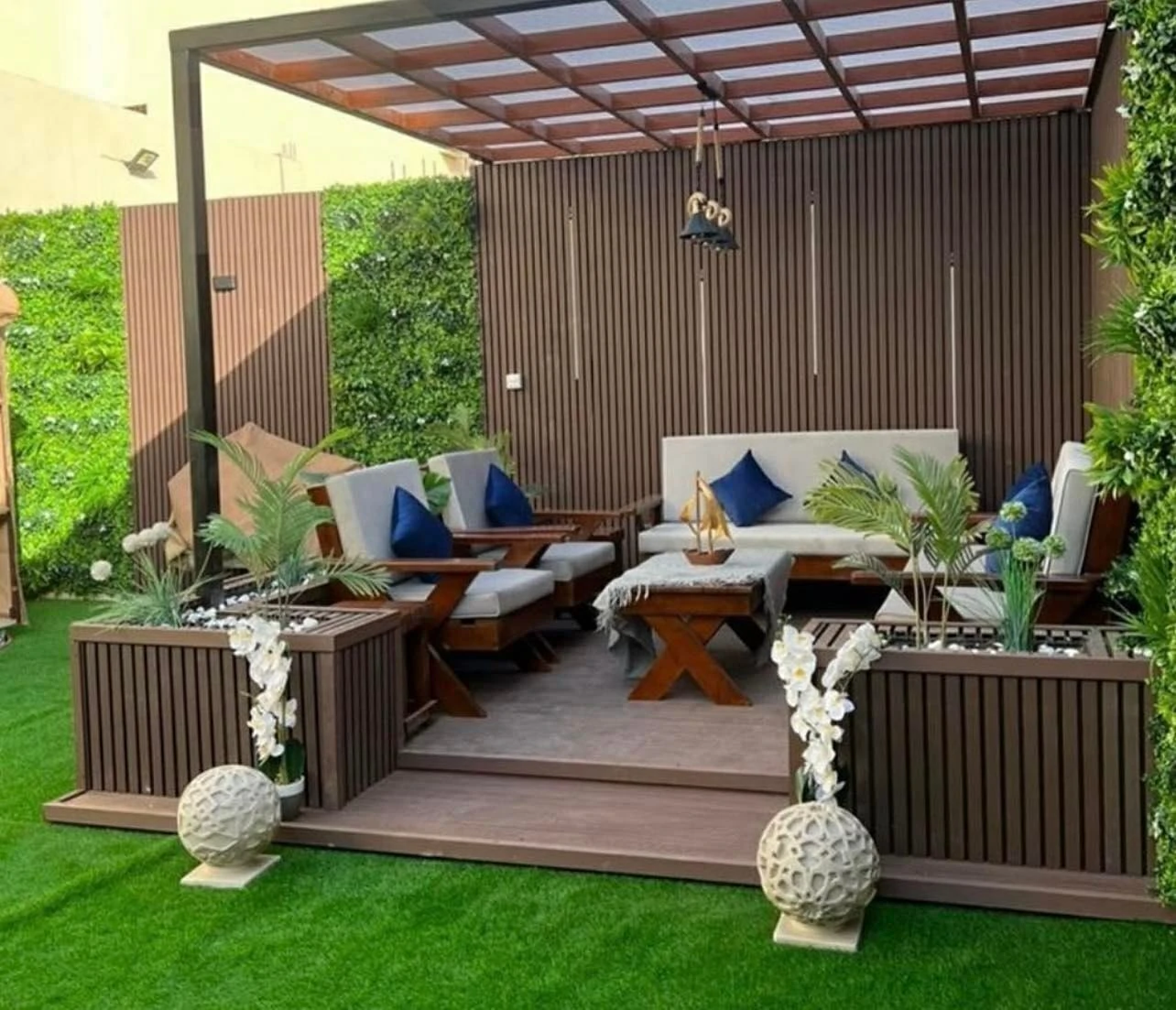 - الخصوصية: الاعتماد على جدران خشبية مفرغةأو أسوار نباتية كثيفةكـ الياسمين الهندي أو الورد لضمان الخصوصية والجمالية.